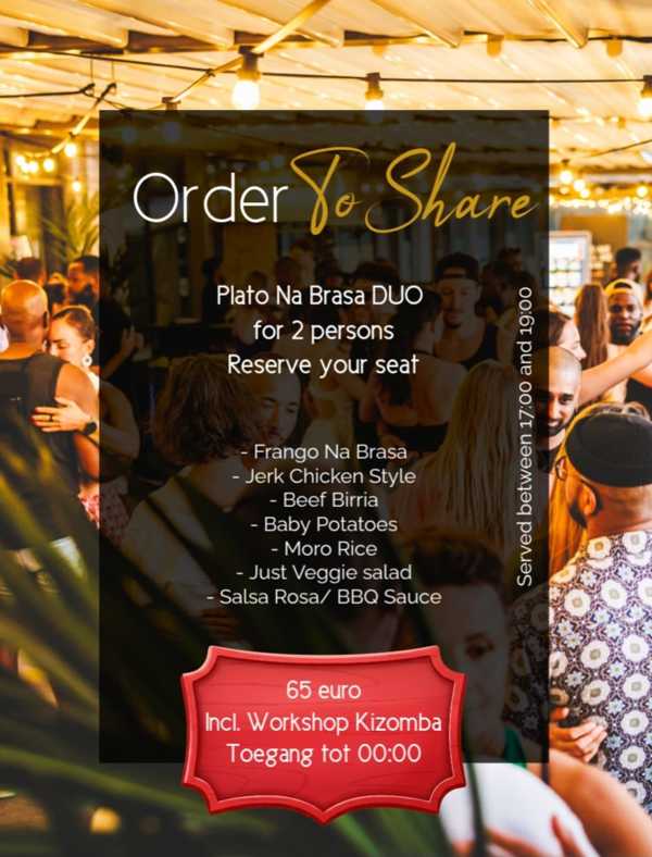 Come earlier for the special plato Na Brasa Duo for 65 euro inclusive entree to the event and workshop Kizomba.