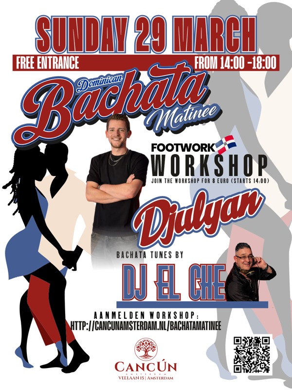 Sunday afternoon means Bachata time at Restaurant & Bar Cancún Amsterdam. Join us for another edition of the Dominican Bachata Matinée, where dancers come together to enjoy authentic Dominican Bachata, great music and a vibrant social dance atmosphere.