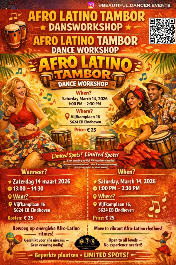 Afro Latino Tambor is een levendige, ritmische, lage dansstijl die zijn roots heeft in Afrika, en is populair bij de kusten van Venezuela en Cuba. Het is gekarakteriseerd door lage bewegingen met sterke focus op heup- en geïsoleerde torsobewegingen. De workshop is toegankelijk voor zowel mannen als vrouwen (je hebt geen partner nodig om mee te doen!). Geen ervaring nodig! De lerares komt van origine uit Venezuela, heeft een dansschool in Utrecht en komt speciaal naar Eindhoven voor deze workshop! Mis het niet! Het enigste wat je nodig hebt om mee te doen is een goed humeur, water en comfortabele schoenen/kleding. Er is na de workshop de mogelijkheid een filmpje te maken van wat je geleerd hebt!
