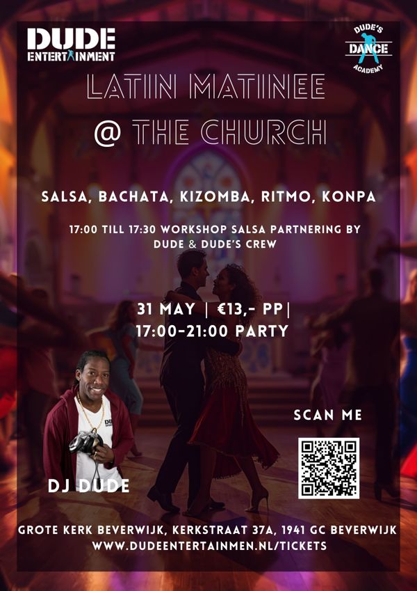 , kom en dans met ons mee in deze prachtige Historische Kerk locatie in Beverwijk. DJ Dude will spin de lekker Salsa, Kizomba & Bachata vibes. Workshop Bachata Salsa Fusion open level by Dude & Crew.