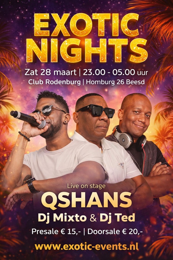 Presale € 15,- tikkie 0627493937. online www.exotic-events.nl