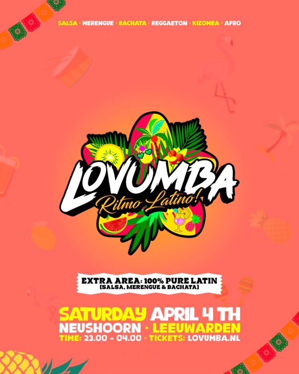 Time: 23:00 – 04:00 Location: Neushoorn, Leeuwarden Info: info@lovumba.nl | +31 6 14659702Join the Lovumba Family, feel the rhythm, live the connection