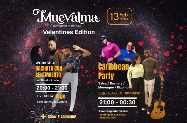 Vr 13 feb 2026: Muevalma *Valentijn*, Workshop Bachata, 2 Dj's * in Hilversum