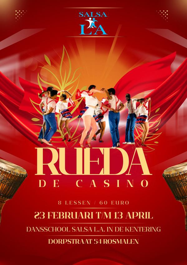 Rueda de Casino is een groepsdans waarin minimaal drie paren in een cirkel salsa combinaties dansen die door 1 leider op commando wordt doorgeven. De dans is afkomstig uit Cuba. Een Rueda geeft vooraf heel veel plezier met elkaar door ook continu met de volgende dame te dansen op de commando`s.