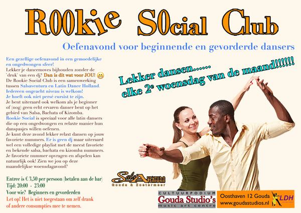De Rookie Social Club is een samenwerking tussen Salsaventura Gouda/Zoetermeer en LatinDance Holland. Je hoeft nietpersé cursist te zijn of aangesloten te zijn aan een dansschool. Iedereen is welkom ongeacht het niveau ! De entree is maar € 3,50 dus daar hoef je het niet voor te laten..;)