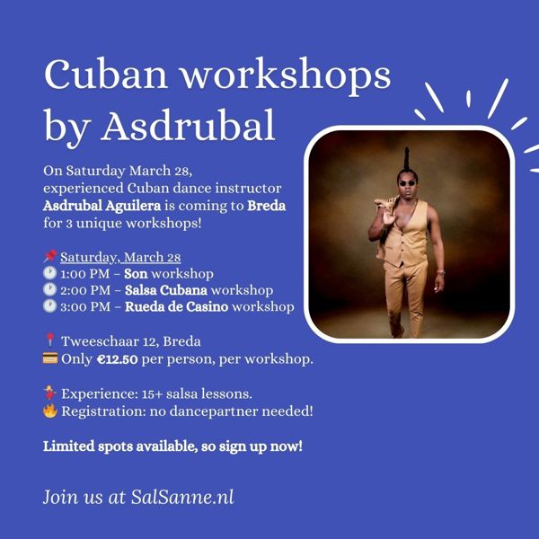 Ben jij klaar om je salsa moves naar een hoger niveau te tillen met een flinke dosis Cubaanse energie? Op zaterdag 28 maart hebben we een wel héél bijzondere gast in Breda. Niemand minder dan Asdrubal Aguilera, rechtstreeks uit Cuba, komt zijn passie en kennis met ons delen!